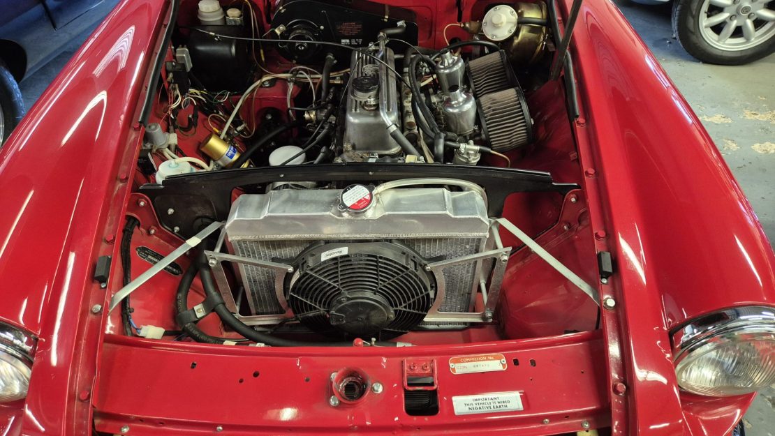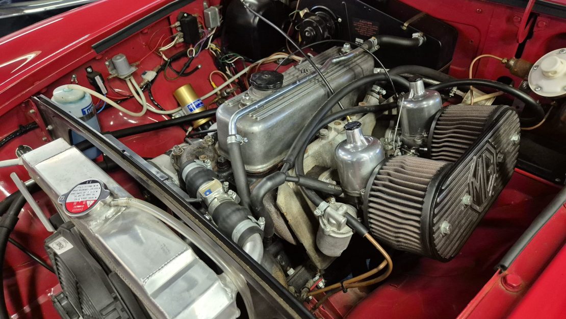 Fully restored with on a sandblasted bodyshell by Mike Rolls MG Centre IN 2021.Tartan red, chrome wires , mohair hood and